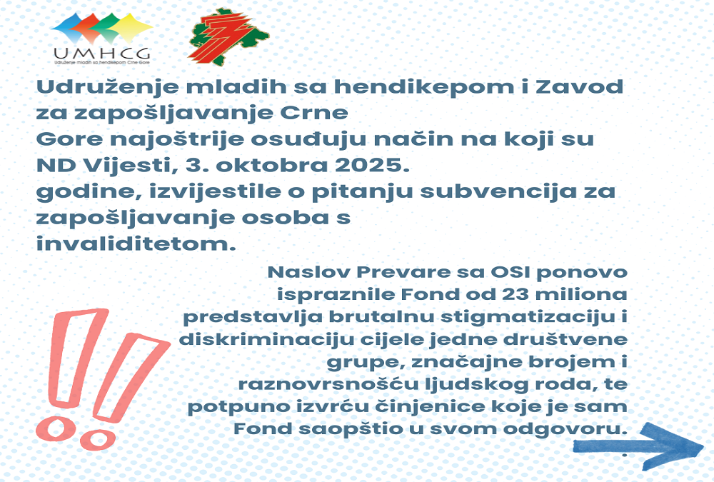 Udruženje mladih sa hendikepom i Zavod za zapošljavanje Crne Gore najoštrije osuđuju način na koji su ND Vijesti, 3. oktobra 2025. godine, izvijestile o pitanju subvencija za zapošljavanje osoba s invaliditetom. Naslov Prevare sa OSI ponovo ispraznile Fond od 23 miliona predstavlja brutalnu stigmatizaciju i diskriminaciju cijele jedne društvene grupe, značajne brojem i raznovrsnošću ljudskog roda, te potpuno izvrću činjenice koje je sam Fond saopštio u svom odgovoru.