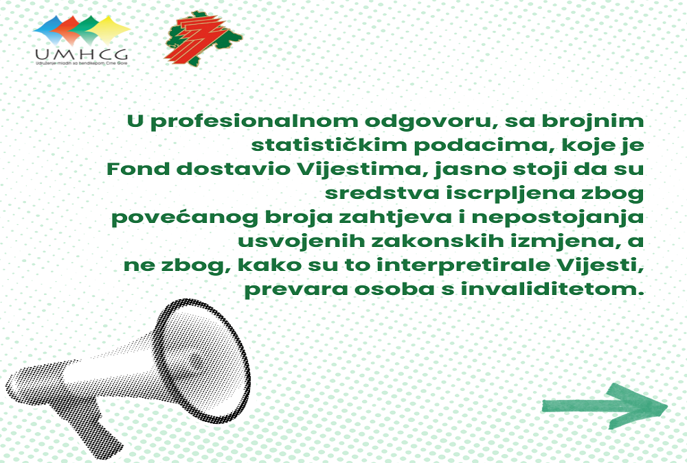 U profesionalnom odgovoru, sa brojnim statističkim podacima, koje je Fond dostavio Vijestima, jasno stoji da su sredstva iscrpljena zbog povećanog broja zahtjeva i nepostojanja usvojenih zakonskih izmjena, a ne zbog, kako su to interpretirale Vijesti, prevara osoba s invaliditetom.
