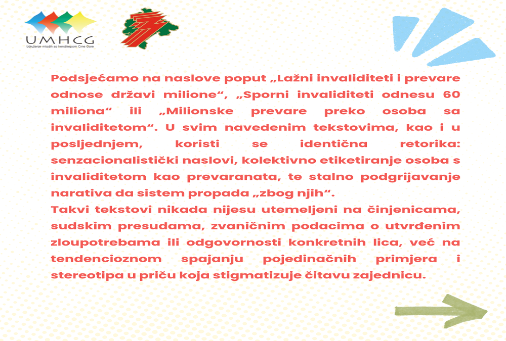 Podsjećamo na naslove poput „Lažni invaliditeti i prevare odnose državi milione“, „Sporni invaliditeti odnesu 60 miliona“ ili „Milionske prevare preko osoba sa invaliditetom“. U svim navedenim tekstovima, kao i u posljednjem, koristi se identična retorika: senzacionalistički naslovi, kolektivno etiketiranje osoba s invaliditetom kao prevaranata, te stalno podgrijavanje narativa da sistem propada „zbog njih“. Takvi tekstovi nikada nijesu utemeljeni na činjenicama, sudskim presudama, zvaničnim podacima o utvrđenim zloupotrebama ili odgovornosti konkretnih lica, već na tendencioznom spajanju pojedinačnih primjera i stereotipa u priču koja stigmatizuje čitavu zajednicu.