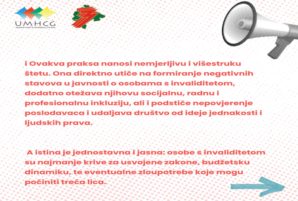 Ovakva praksa nanosi nemjerljivu i višestruku štetu. Ona direktno utiče na formiranje negativnih stavova u javnosti o osobama s invaliditetom, dodatno otežava njihovu socijalnu, radnu i profesionalnu inkluziju, ali i podstiče nepovjerenje poslodavaca i udaljava društvo od ideje jednakosti i ljudskih prava.