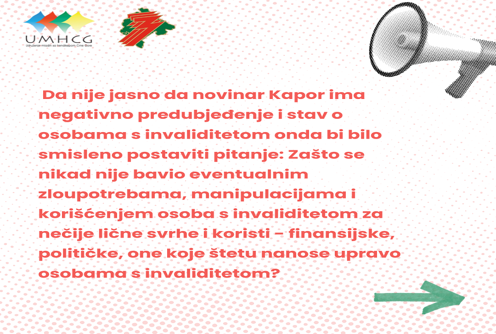 Da nije jasno da novinar Kapor ima negativno predubjeđenje i stav o osobama s invaliditetom onda bi bilo smisleno postaviti pitanje: Zašto se nikad nije bavio eventualnim zloupotrebama, manipulacijama i korišćenjem osoba s invaliditetom za nečije lične svrhe i koristi – finansijske, političke, one koje štetu nanose upravo osobama s invaliditetom?