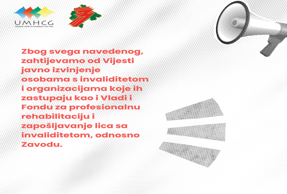 Zbog svega navedenog, zahtijevamo od Vijesti javno izvinjenje osobama s invaliditetom i organizacijama koje ih zastupaju kao i Vladi i Fondu za profesionalnu rehabilitaciju i zapošljavanje lica sa invaliditetom, odnosno Zavodu.